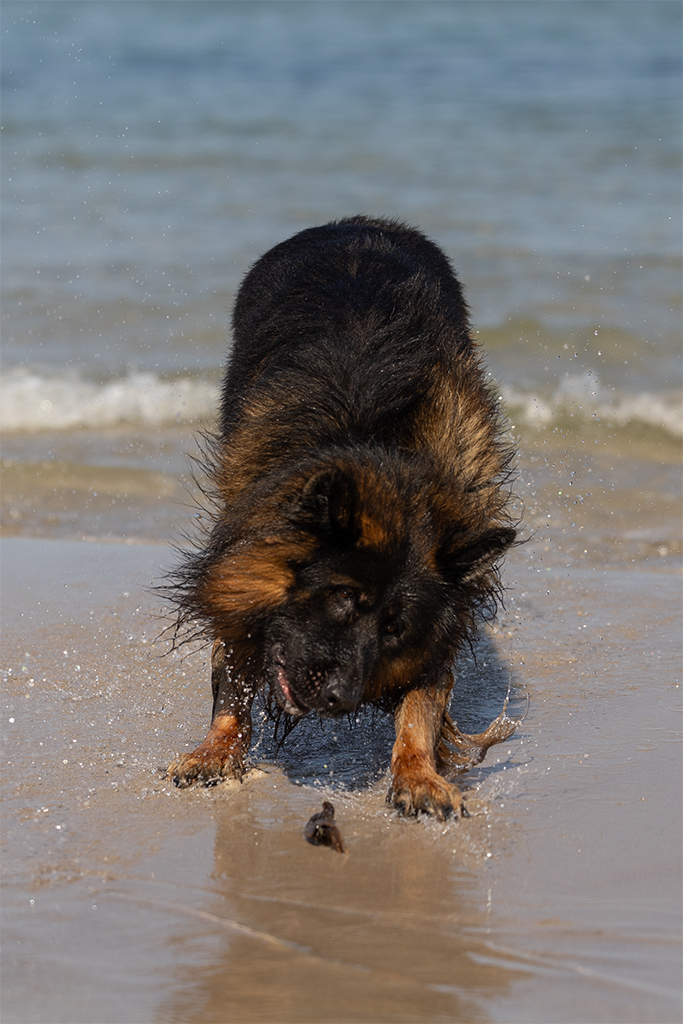 Po dotarciu do psiej plaży były kąpiele małe i duże. Morskie fale zapewniły naszemu psu doskonałą zabawę 😉 Baku bardzo chętnie wskakiwał do wody oraz aportował. Na plaży nawiązał też nowe psie znajomości.