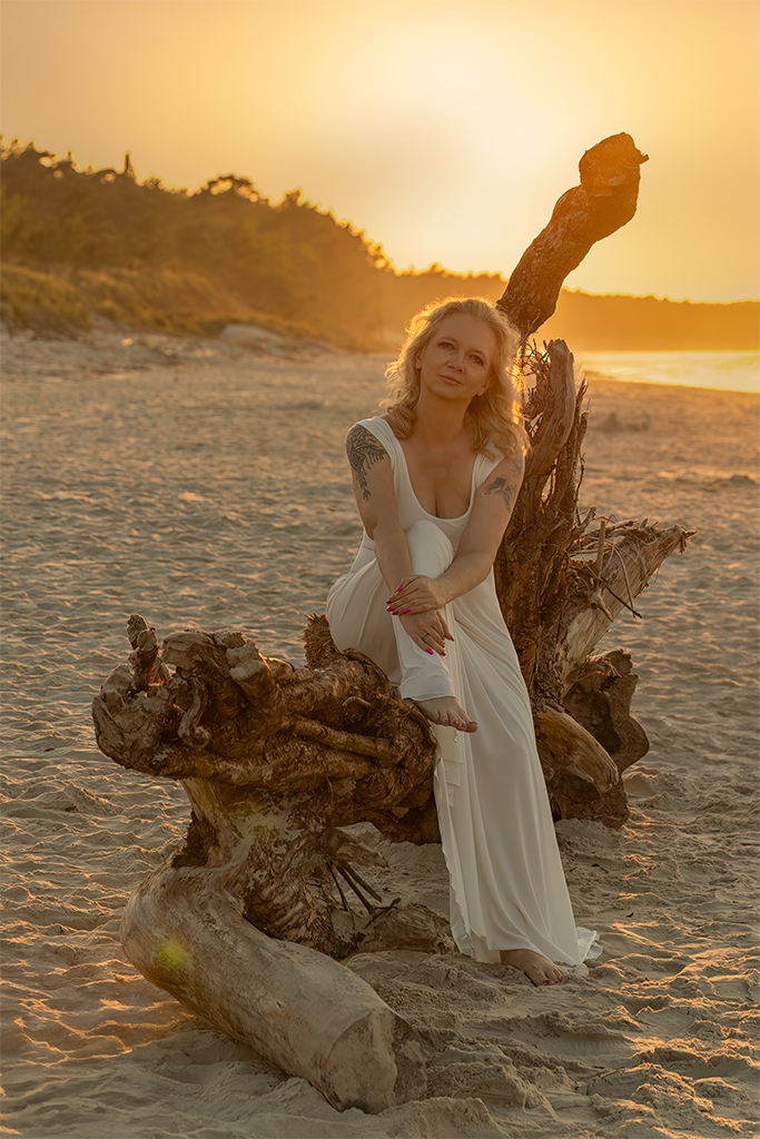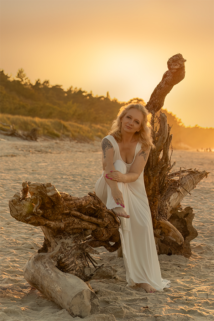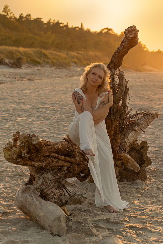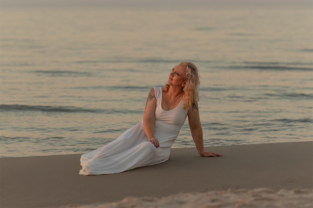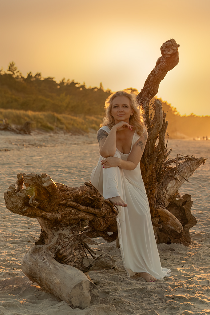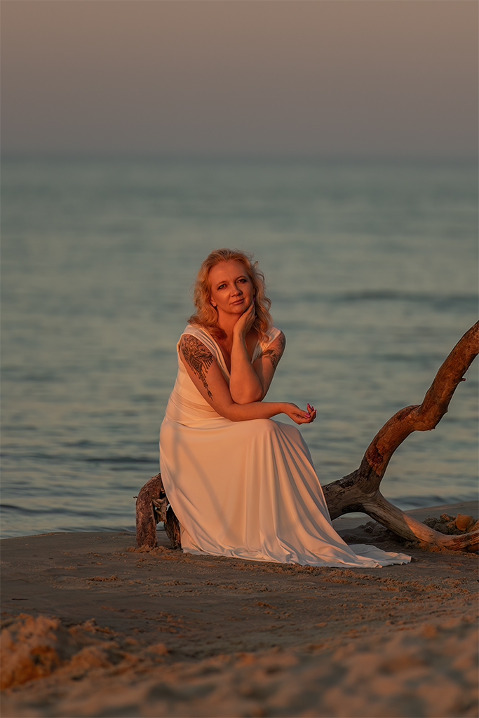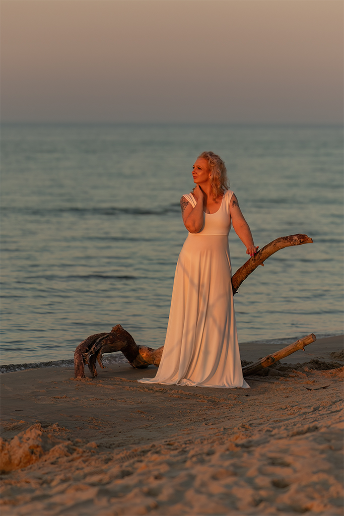 Kolejnym etapem były zdjęcia z brzegu z pięknymi morskimi pastelami w tle. Po kolorze mojej skóry możecie łatwo się domyślić, z której strony mieliśmy zachodzące słonko.