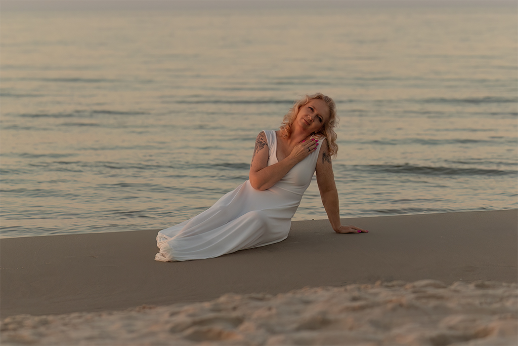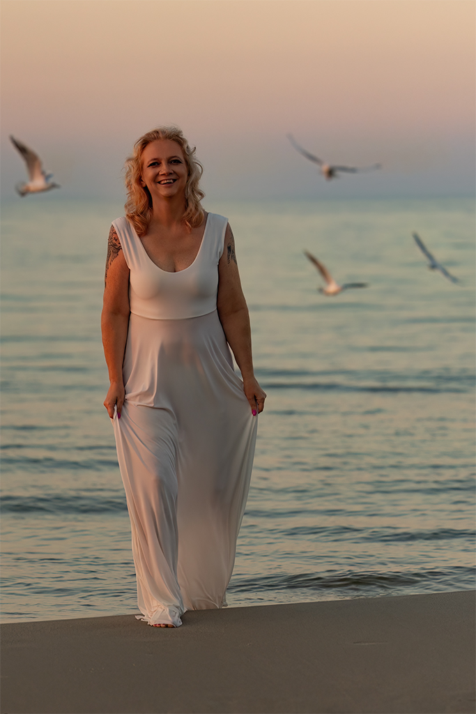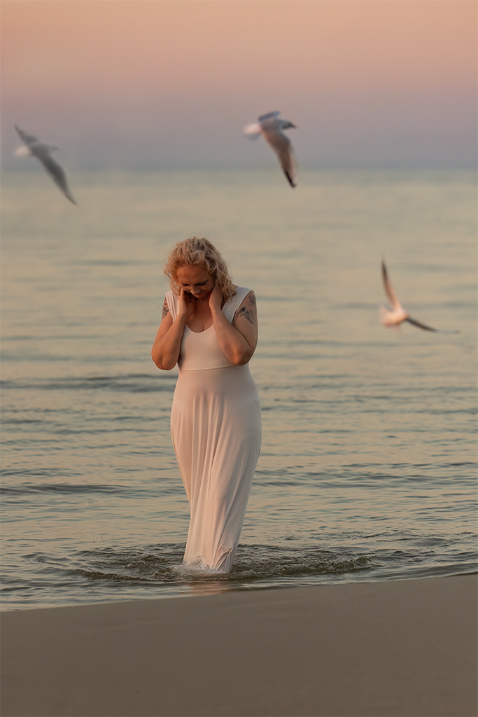 Zdecydowałam się również na wejscie do wody, aby Dominik mógł zrobić również kilka takich ujęć. Latające ptaki za moimi plecami zobaczyłam dopiero w domu, po ściągnięciu zdjęć na komputer. Ich obecność w kadrze okazała się być dla mnie miłą niespodzianką.