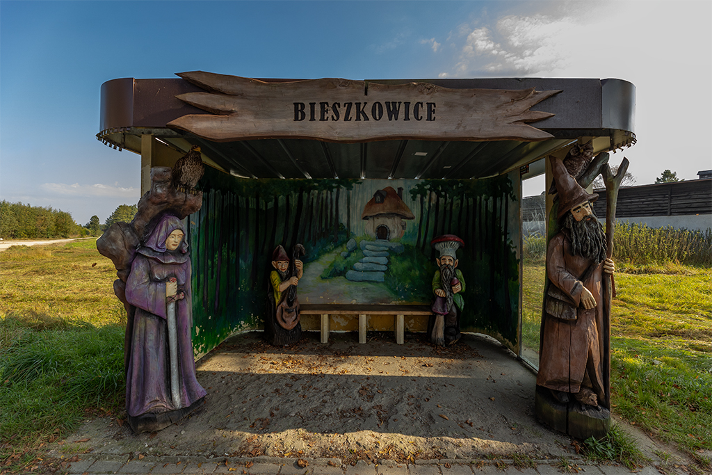Dawno nie jechaliśmy taką piękną trasą. W Bieszkowicach i Nowym Dworze Wejherowskim warto zwolnić i zwrócić uwagę na takie cudne przystanki – jeden na poniższym zdjęciu.