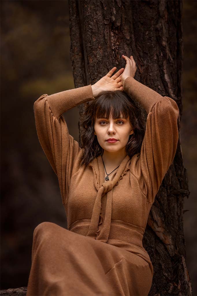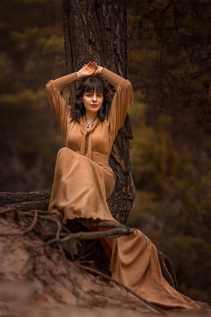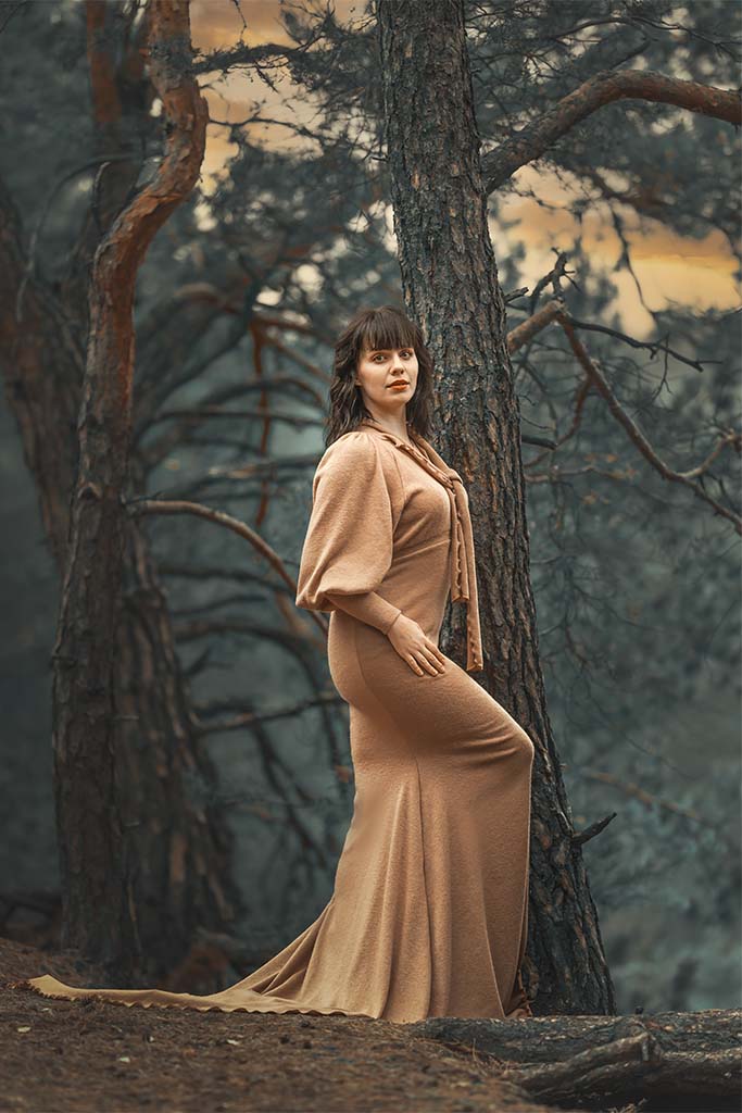Długa linia sukienki sięga do kolan, z tyłu posiada tren.